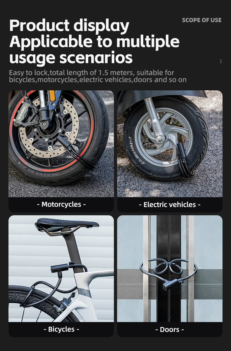 Easy to lock,total length of 1.5 meters,suitable for bicycles,motorcycles,electric vehicles,doors and so on