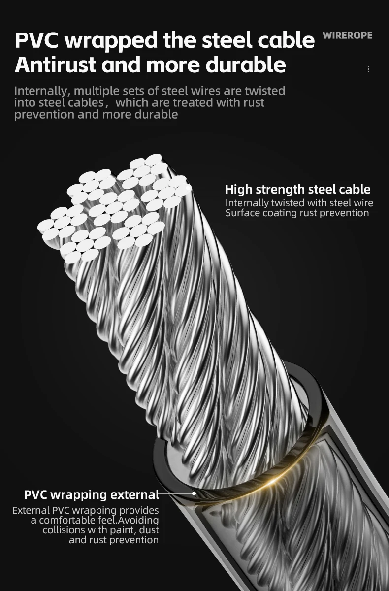 lnternally, multiple sets of steel wires are twisted into steel cables, which are treated with rust prevention and more durable