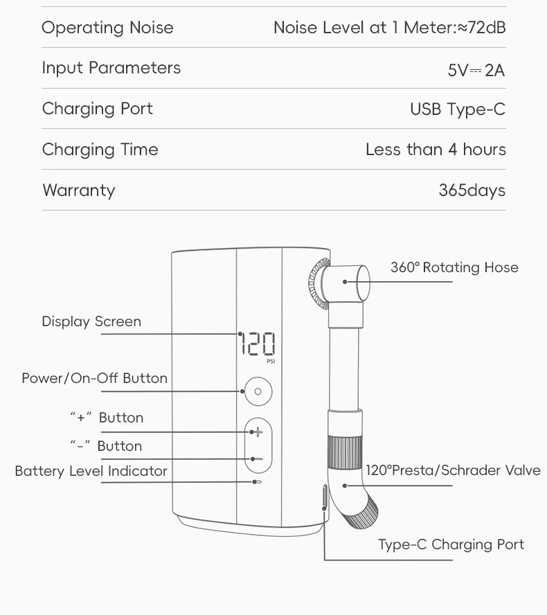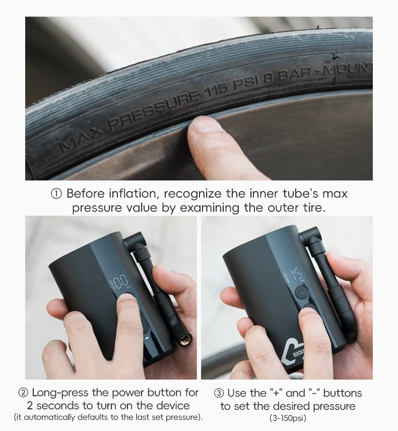 Equipped with an internal pressure sensor, the Mini Inflator detects tire pressure with an accuracy of ±1psi. After setting the desired pressure, you can start inflation with a single button press, and it stops automatically when the target pressure is reached.